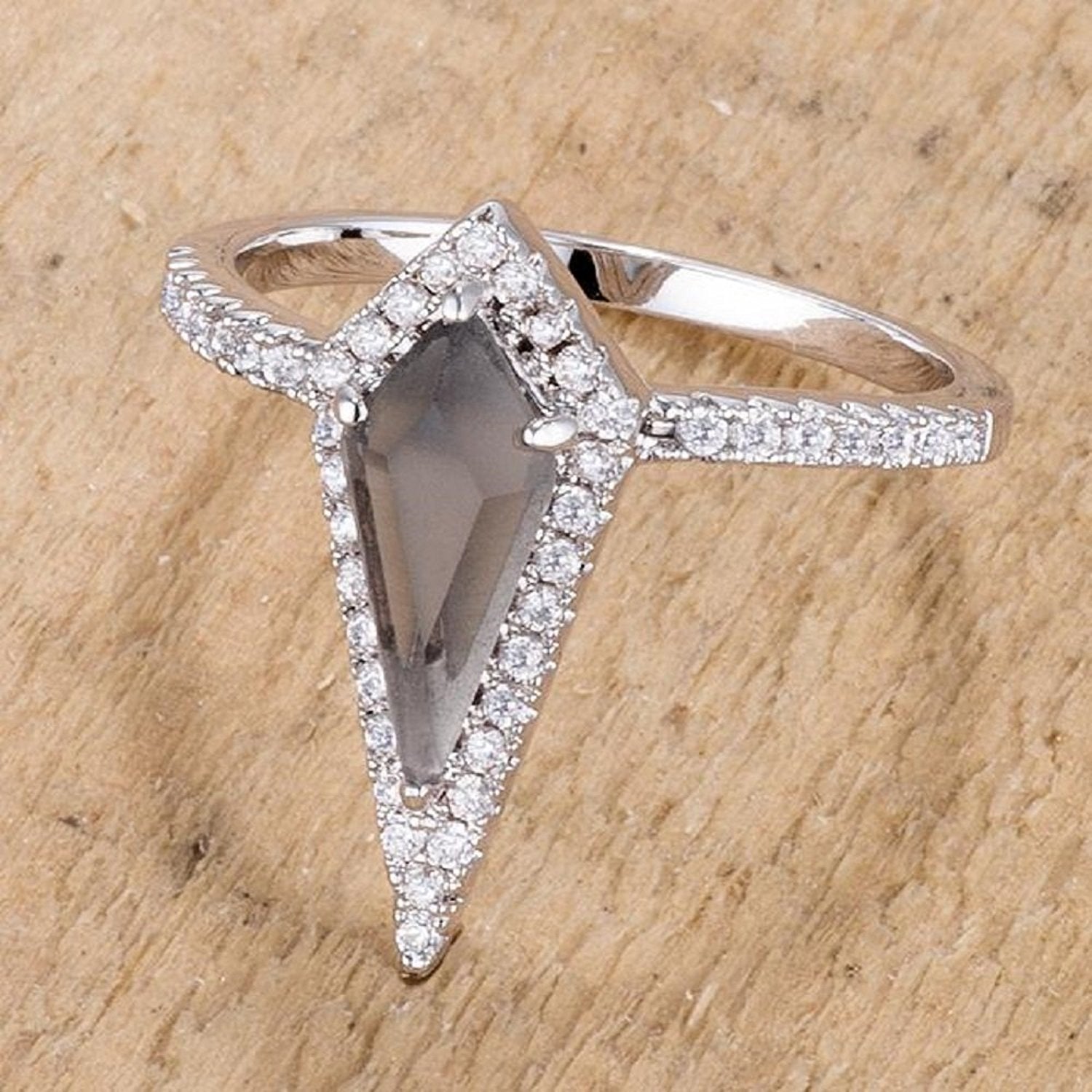 - The Smokey Topaz center stone rests on a rhodium setting surrounded by round --clear cubic zirconia that also accents the band.