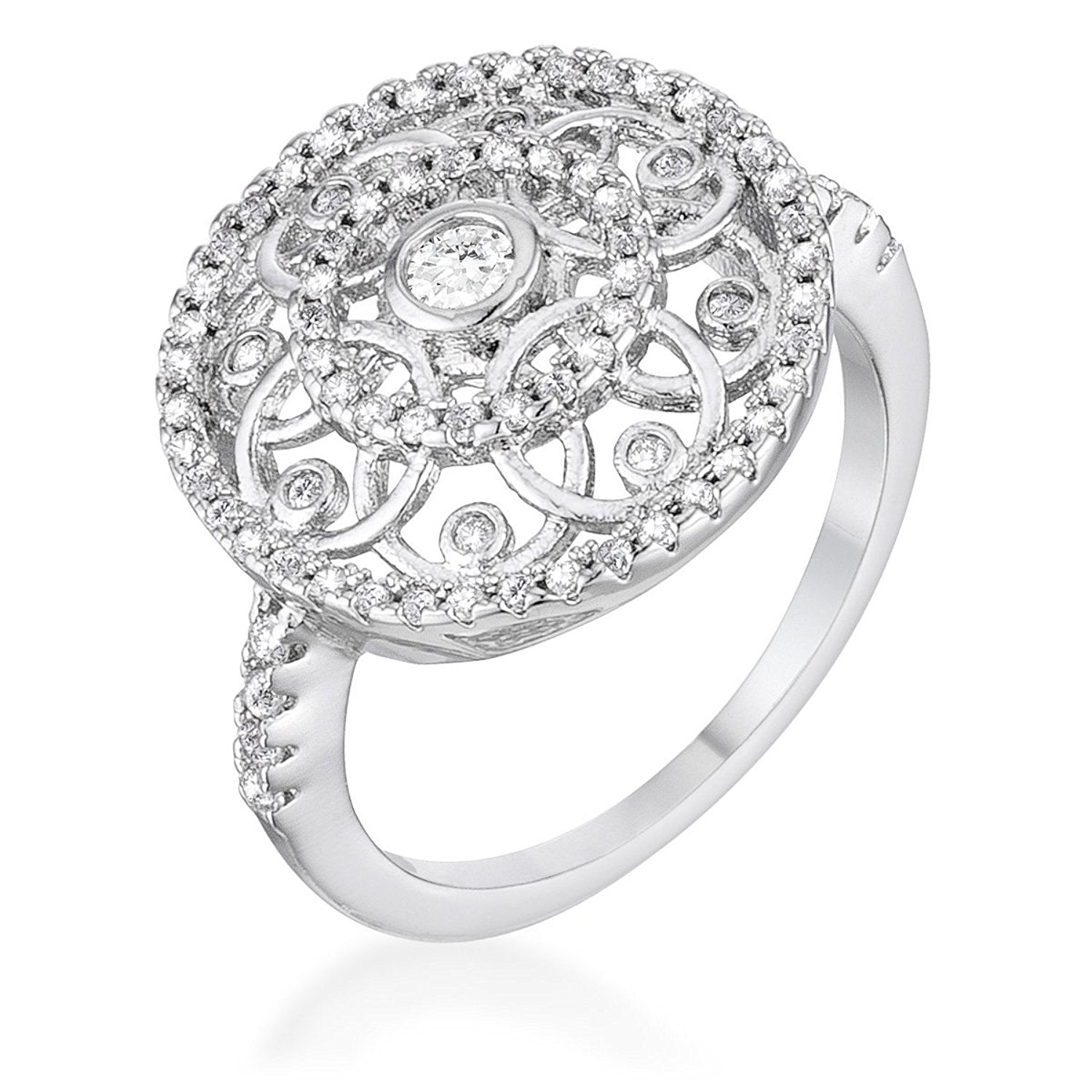 - The lovely interlocking circle design of this ring is complimented by round cubic zirconia sparkles from the larger center to the cubic zirconia that accents all over. it is crafted with rhodium plating -- which is the same process that gives white gold its shine.