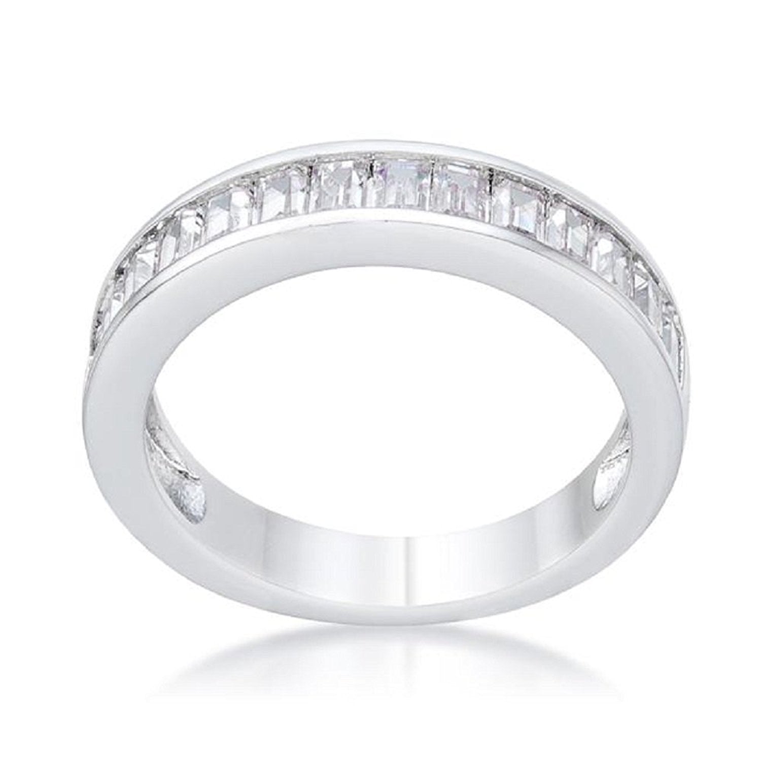 - For old world elegance mixed perfectly with sleek modern design -- there is no better choice than this band. The brilliant shine is achieved with rhodium plating -- the same process used with white gold. The cubic zirconia is cut in an baguette cut and totals .77Ct -- and that allows a beautiful geometric placement on the band for stylish -- upscale effect. This ring belongs on the one you love!