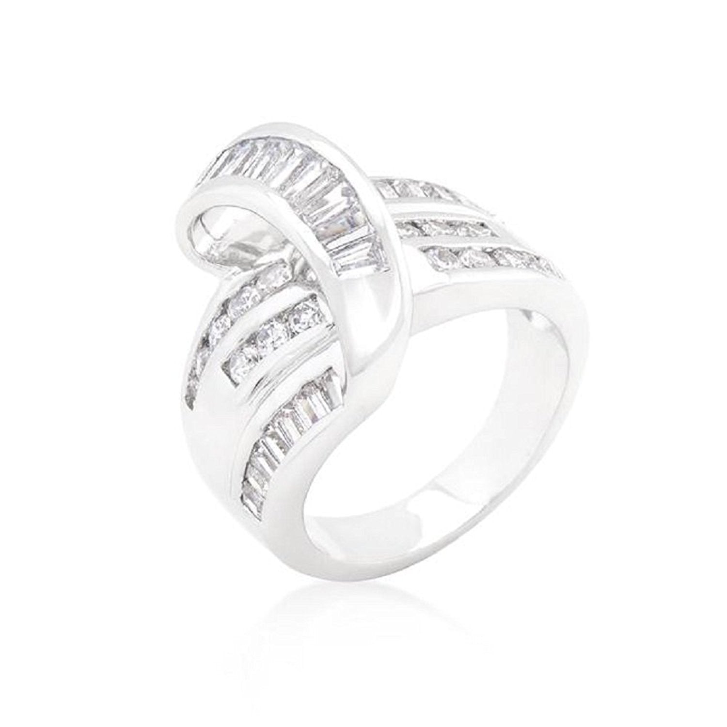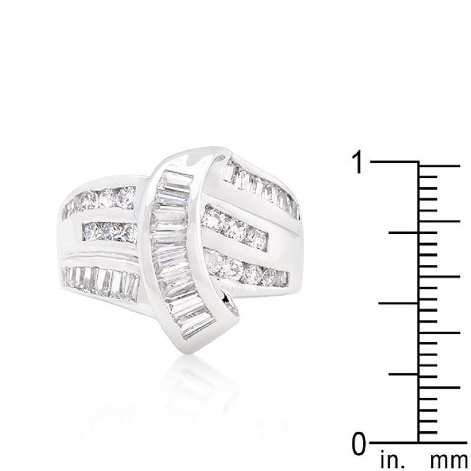 - Channel set cubic zirconia stones in a diagonal design mingle together to create this classic -- overlapping cocktail piece. Our genuine rhodium finish is achieved using an electroplating process that coats the item with heavy layers of rhodium -- a close cousin to platinum -- which gives our jewelry a platinum luster.