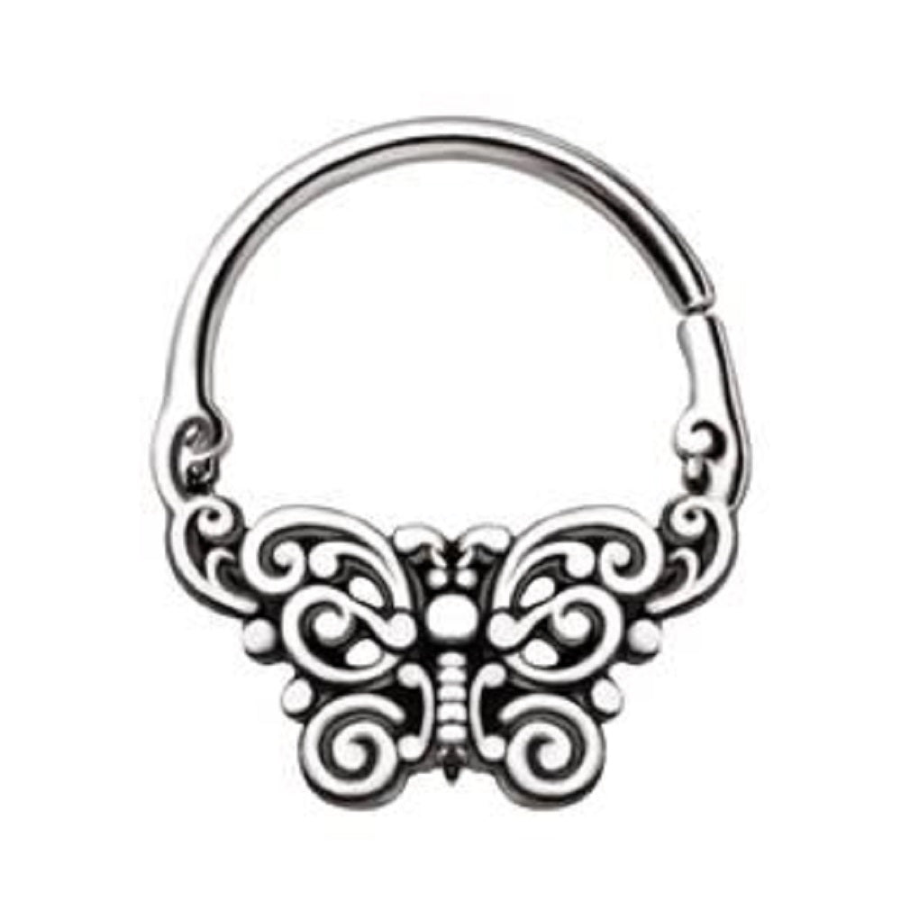 - Detailed design of ornate butterfly. Easy to open annealed ring. Jewelry can be worn as Septum Ring, Cartilage Earring, and more.Lightweight and comfortable to wear.