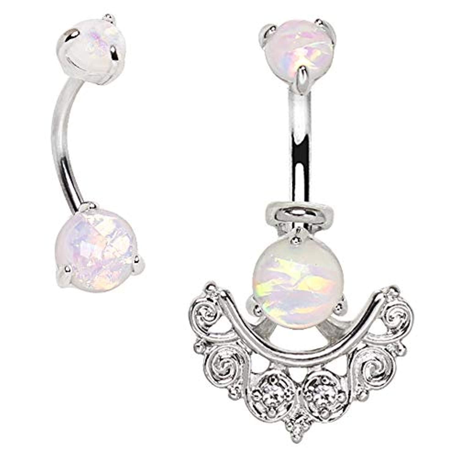 • Navel Ring with Prong Set White Synthetic Opal. Removal ornate design bottom piece. Bottom piece is decorated with Clear CZ. Lightweight and comfortable to wear.
