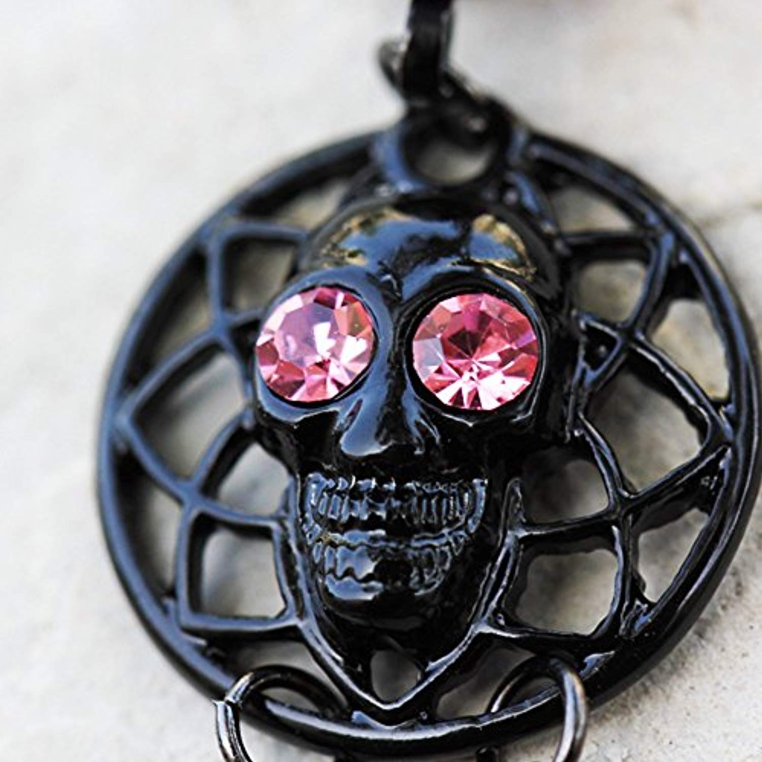 - Black PVD plated Jewelry.Black Alien Skull with Pink CZ eyes.Multi length chained Stars dangling from the Alien Skull. Lightweight and comfortable to wear.